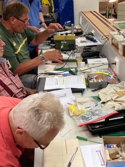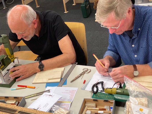 Een flink aantal vrijdagavonden is er hard gewerkt aan de spoorbomen (met behang !!). De deelnemers hebben al hun vaardigheden moeten aanspreken om dit vaak lastige “priegelwerk” voor elkaar te krijgen. Maar dat betekent ook dat er nieuwe handvaardigheid is verkregen, die in de verdere hobbytoekomst van pas zal komen. Hulde aan de cursusleider Henk vd Vlag, die naast het geven van uitleg en hulp waar nodig, ook veel werk had gemaakt van de voorbereiding. Elke deelnemer kreeg een assortiment hulpmiddelen waarmee het werk kon worden vereenvoudigd. Uitstekend ! De workshop heeft gezorgd voor een mooie hobby ambiance en dat werkt aanstekelijk. Op naar een volgend werk !